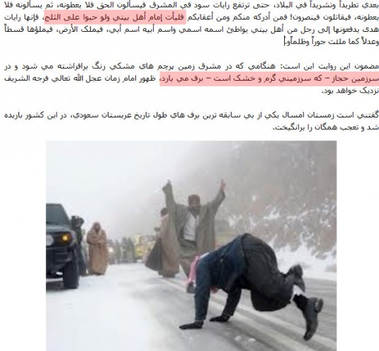 هنگامی که در سرزمین حجاز برف می بارد، ظهور امام زمان عجل الله فرجه نزدیک خواهد بود.