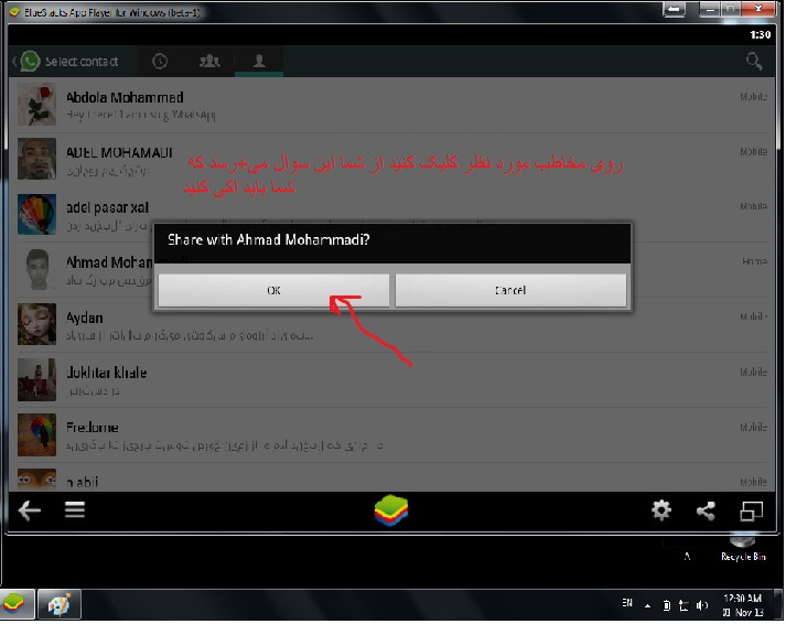 ابتدا برای مخاطبی که میخواهید عکس بفرستید کلیک کنید تا وارد ان شوید بعد در کامپیوتر پوشه ای که حاوی عکس هست کلیک کنید و عکس مورد نظر را با دراگ کردن توی bluestack بندازید از شما میپرسه که به کدوم برنامه میخواید بفرستید (طبق عکس زیر) شما واتس اپ رو انتخاب کنید و بعد مخاطب مورد نظر.